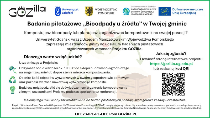 W ramach projektu LIFE23-IPE-PL-LIFE Pom GOZilla.PL „Wdrożenie Planu Gospodarki Odpadami dla Województwa Pomorskiego (PGOWP) uwzględniającego hierarchię sposobów postępowania z odpadami komunalnymi oraz zasady gospodarki cyrkularnej (GOZ)” finansowanego przez Komisję Europejską w ramach programu LIFE oraz współfinansowanego przez Narodowy Fundusz Ochrony Środowiska i Gospodarki Wodnej rozpoczynamy w gminach Rumia, Sztum i Kaliska rekrutację do badań pilotażowych „Bioodpady u źródła” indywidualnych gospodarstwach domowych w Państwa gminie.