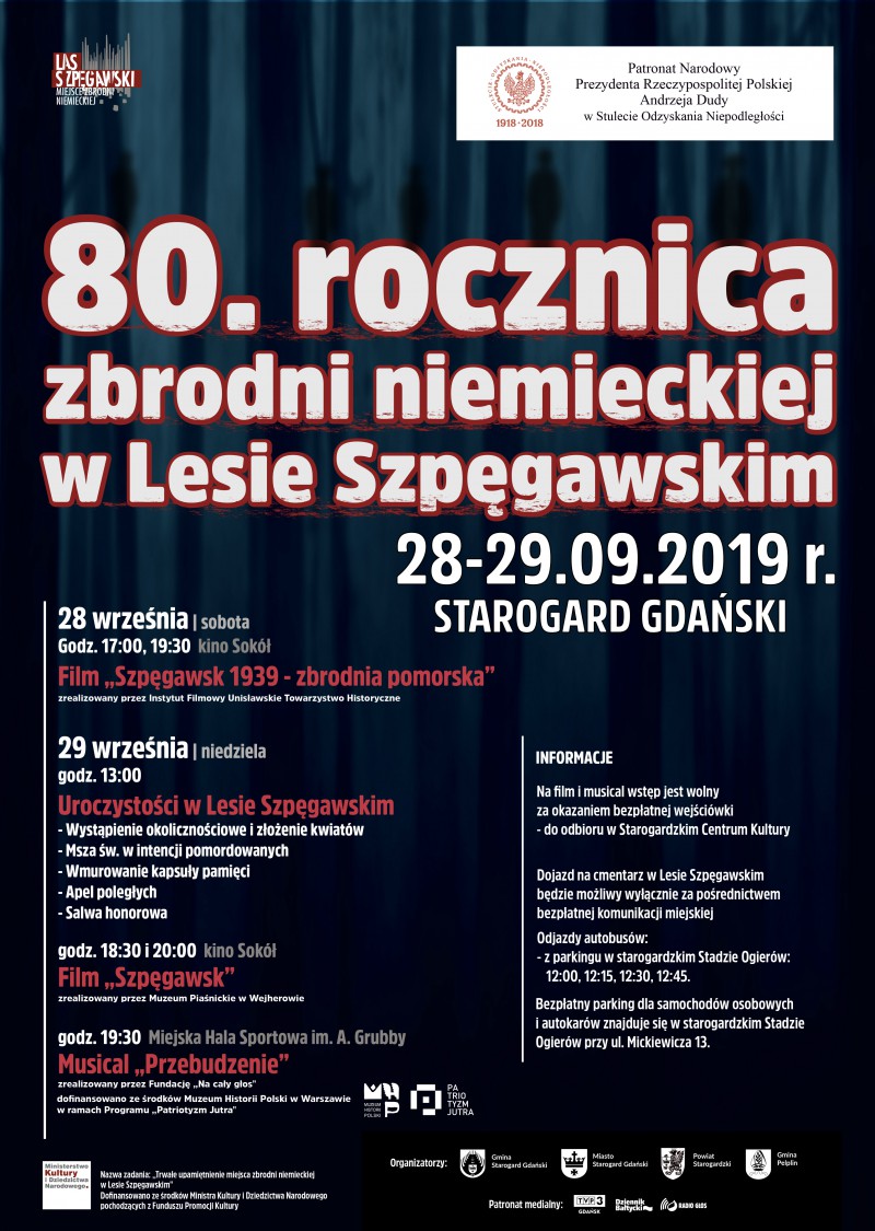Wójt Gminy Starogard, Prezydent Miasta Starogard, Starosta Starogardzki oraz Burmistrz Miasta i Gminy Pelplin zapraszają do udziału w obchodach 80. rocznicy niemieckiej zbrodni w Lesie Szpęgawskim. Oficjalne uroczystości rozpoczną się na cmentarzu w Lesie Szpęgawskim 29 września o godz. 13:00. Podczas obchodów planowane jest odsłonięcie pomnika trwale upamiętniającego pomordowanych Pomorzan w latach 1939-1940.