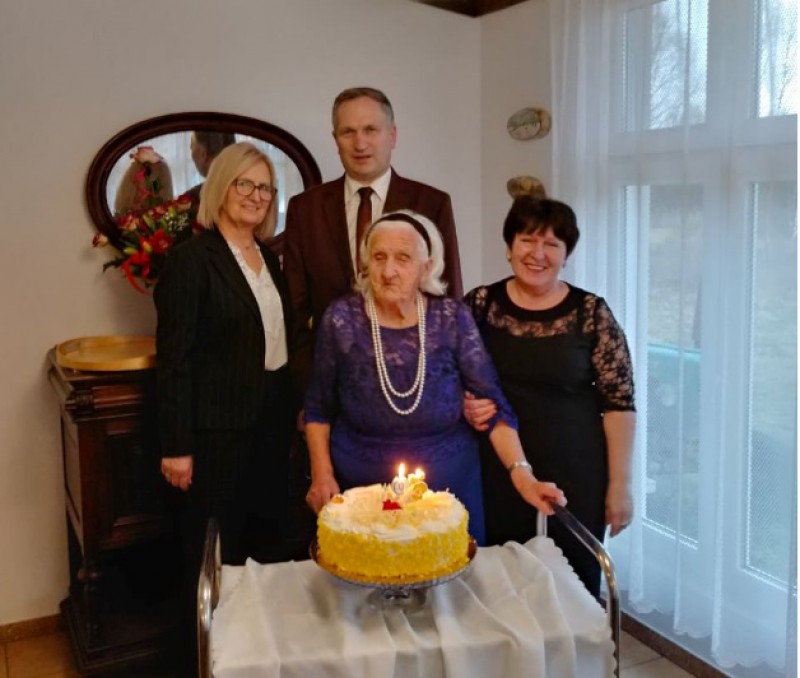 Tradycyjnie o jubileuszu pamiętały też władze Gminy Kaliska i w dniu 25 stycznia z najserdeczniejszymi życzeniami odwiedzili Jubilatkę Wójt Sławomir Janicki wraz z pracownikiem socjalnym Panią Teresą Jagiełlo.