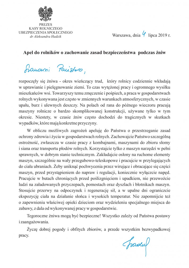 Apel do rolników o zachowanie zasad bezpieczeństwa podczas żniw