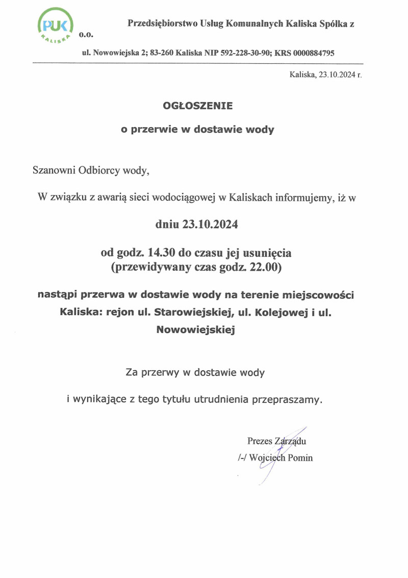 Awaria sieci wodociągowej -ul.Starowiejska, Kolejowa i Nowowiejska w Kaliskach