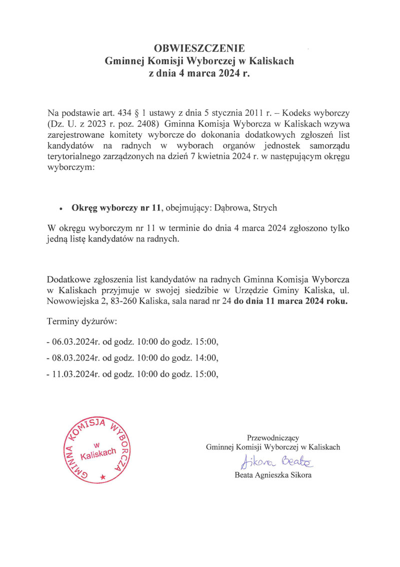 Dodatkowe zgłoszenia list kandydatów na Radnych - Okręg Wyborczy nr 11