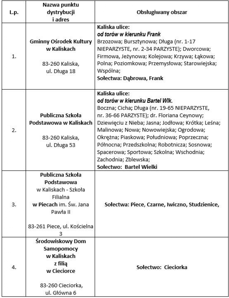 W związku z planowaniem dystrybucji preparatu jodku potasu w przypadku wprowadzenia działań interwencyjnych związanych ze zdarzeniem radiacyjnym, na terenie Gminy Kaliska wyznaczono cztery punkty do dystrybucji preparatu. Do niżej określonych punktów przypisano obszary gminy Kaliska według poniższej tabeli.
