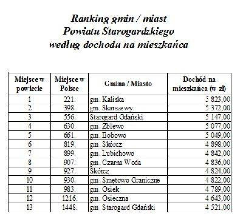 Najwyższe dochody w naszym powiecie osiągnęliśmy właśnie MY z dochodem na jednego mieszkańca 5 823 złote. Na drugie miejsce w zestawieniu GUS zajęła Gmina Skarszewy z dochodem 5 372 złote. Na trzecim miejscu uplasowała się gmina miejska Starogard Gdański z dochodem 5 147 złote.