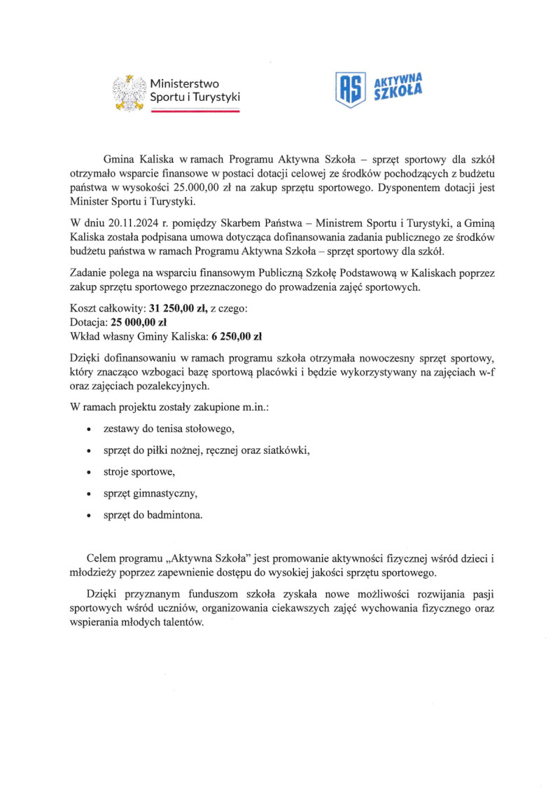 Gmina Kaliska otrzymała wsparcie finansowe w postaci dotacji celowej na zakup sprzętu sportowego