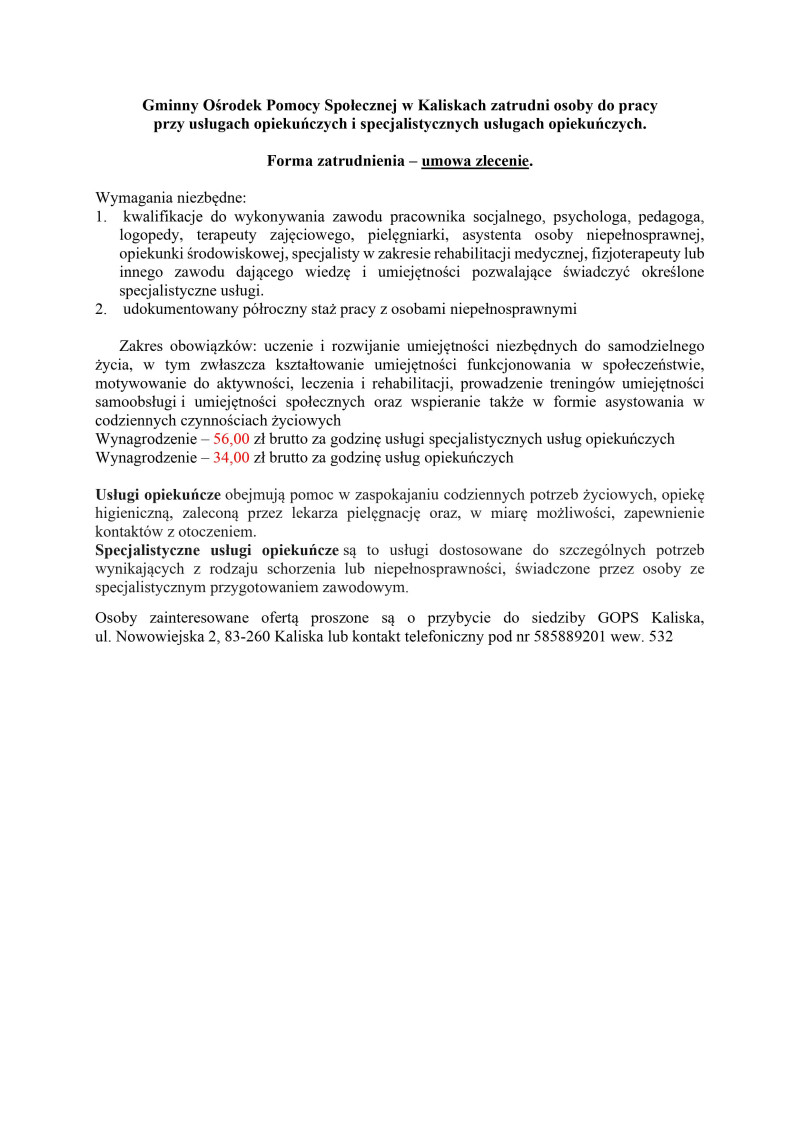 Gminny Ośrodek Pomocy Społecznej w Kaliskach zatrudni osoby do pracy przy usługach opiekuńczych i specjalistycznych usługach opiekuńczych