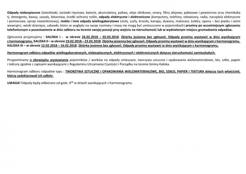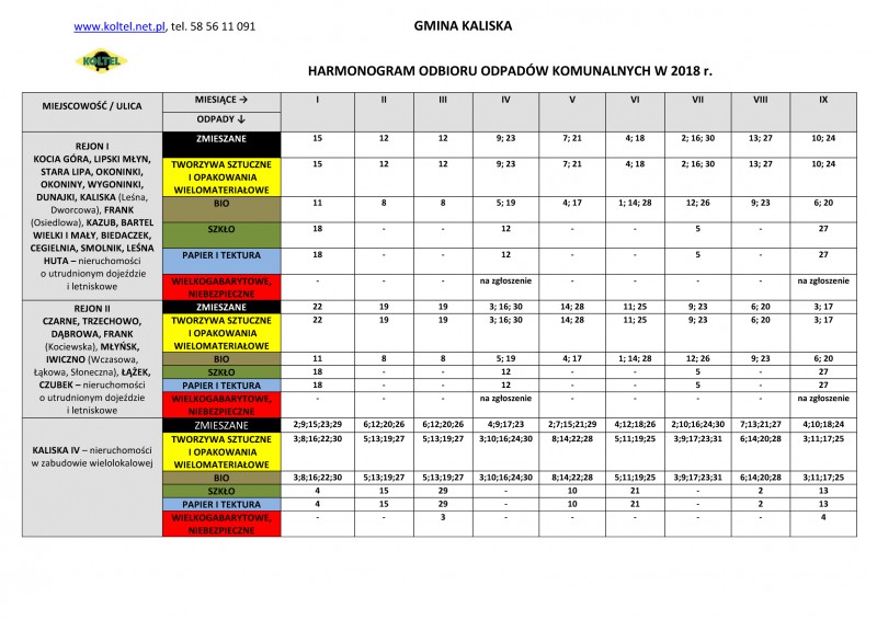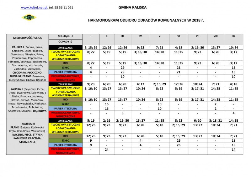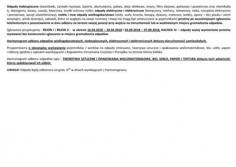 Harmonogram odbioru odpadów komunalnych w 2018r.