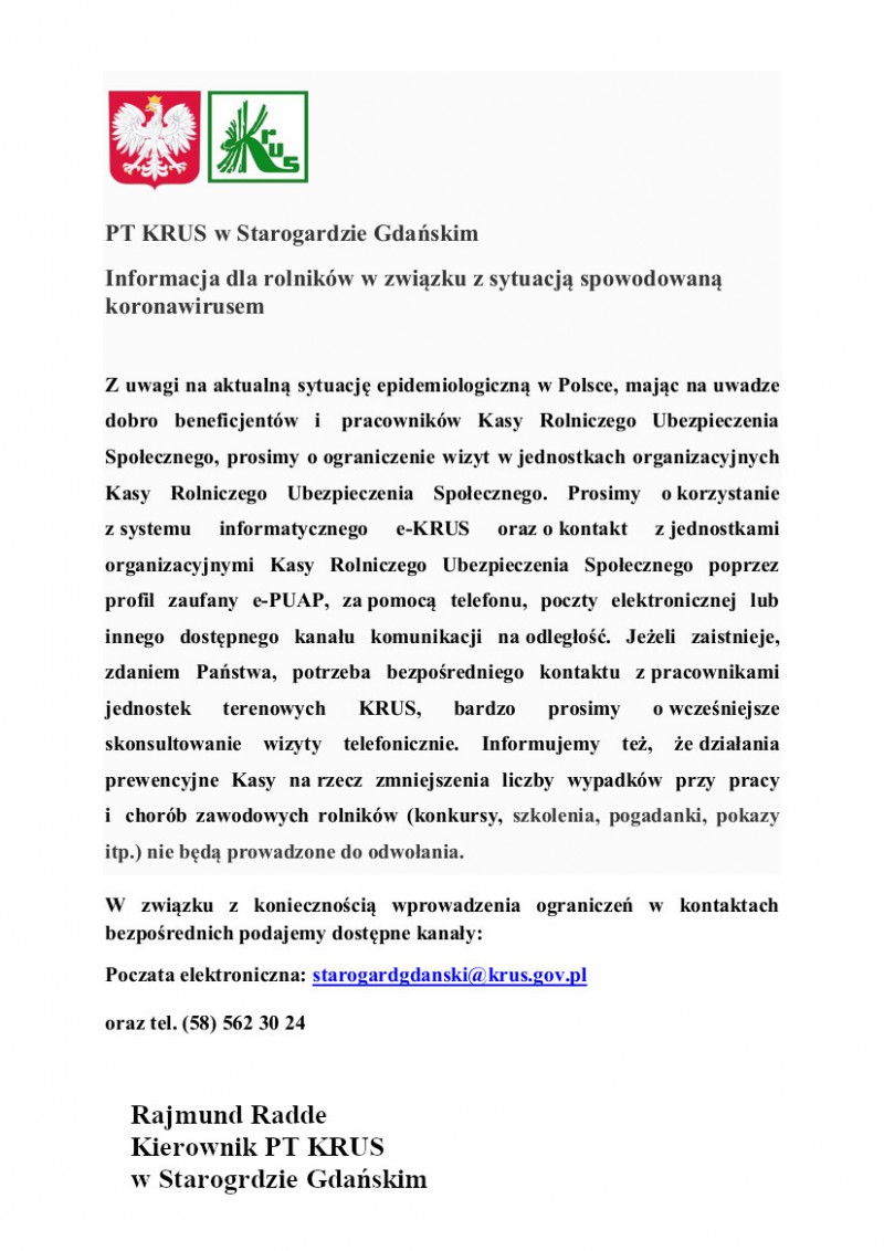 Informacja dla rolników w związku z sytuacją spowodowaną koronawirusem