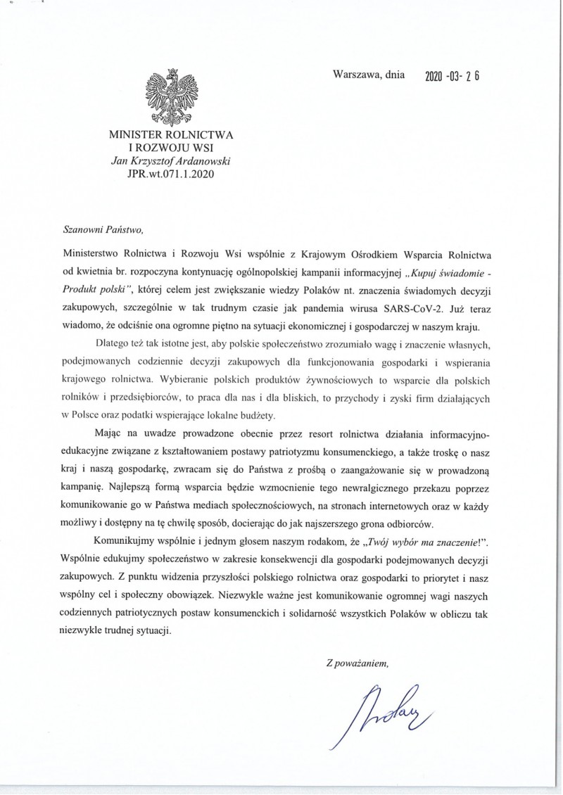 Zachęcamy do zapoznania się z pismem Ministra Rolnictwa i Rozwoju Wsi w sprawie kampanii informacyjnej "Kupuj świadomie - Produkt polski".