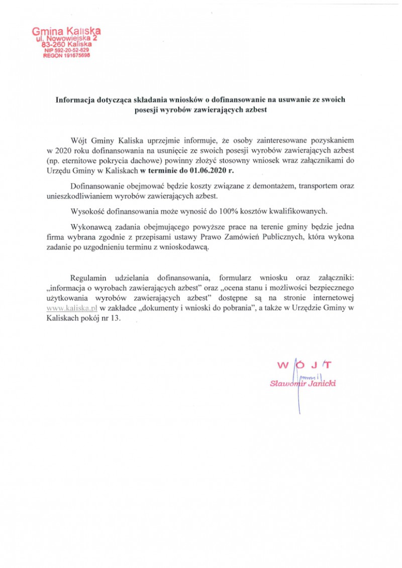 Informacja dot. składania wniosków o dofinansowanie na usuwanie wyrobów zawierających azbest