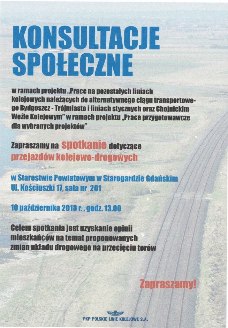 Informacja o konsultacjach publicznych w ramach projektu: "Prace na pozostałych liniach kolejowych należących do alternatywnego ciągu trasportowego Bydgoszcz-Trójmiasto i liniach stycznych oraz Chojnickim Węźle Kolejowym"