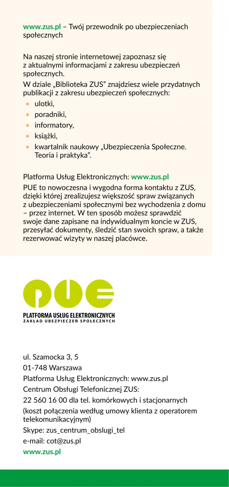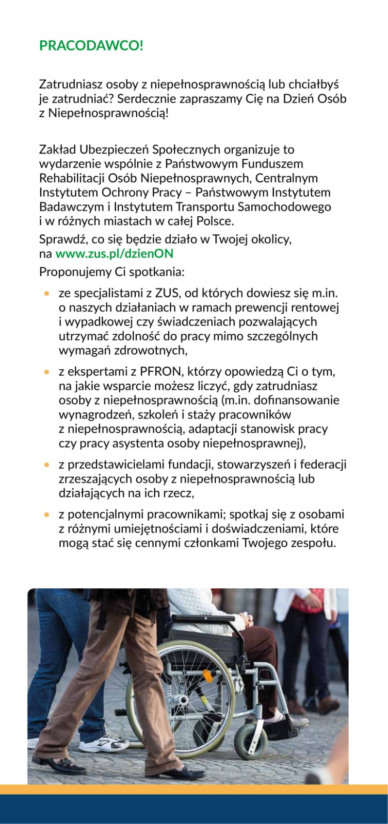 W siedzibie Inspektoratu przy ul. Marszałka Józefa Piłsudskiego 4, od 9 do 14 eksperci z ZUS będą udzielali porad i służyli informacjami dotyczącymi projektów, których celem jest przełamywanie barier w pracy i życiu codziennym. Od specjalistów będzie można dowiedzieć się, jak uzyskać rentę i jak ją zwiększyć, jakie są inne świadczenia. Będzie również można założyć konto na Platformie Usług Elektronicznych, by jak najwięcej spraw z zakresu ubezpieczeń społecznych załatwiać przez internet. Pracodawcy, którzy już zatrudniają osoby z niepełnosprawnością lub chcą je zatrudnić dowiedzą się o działaniach ZUS w ramach prewencji rentowej i wypadkowej czy świadczeniach pozwalających utrzymać zdolność do pracy mimo szczególnych wymagań zdrowotnych.