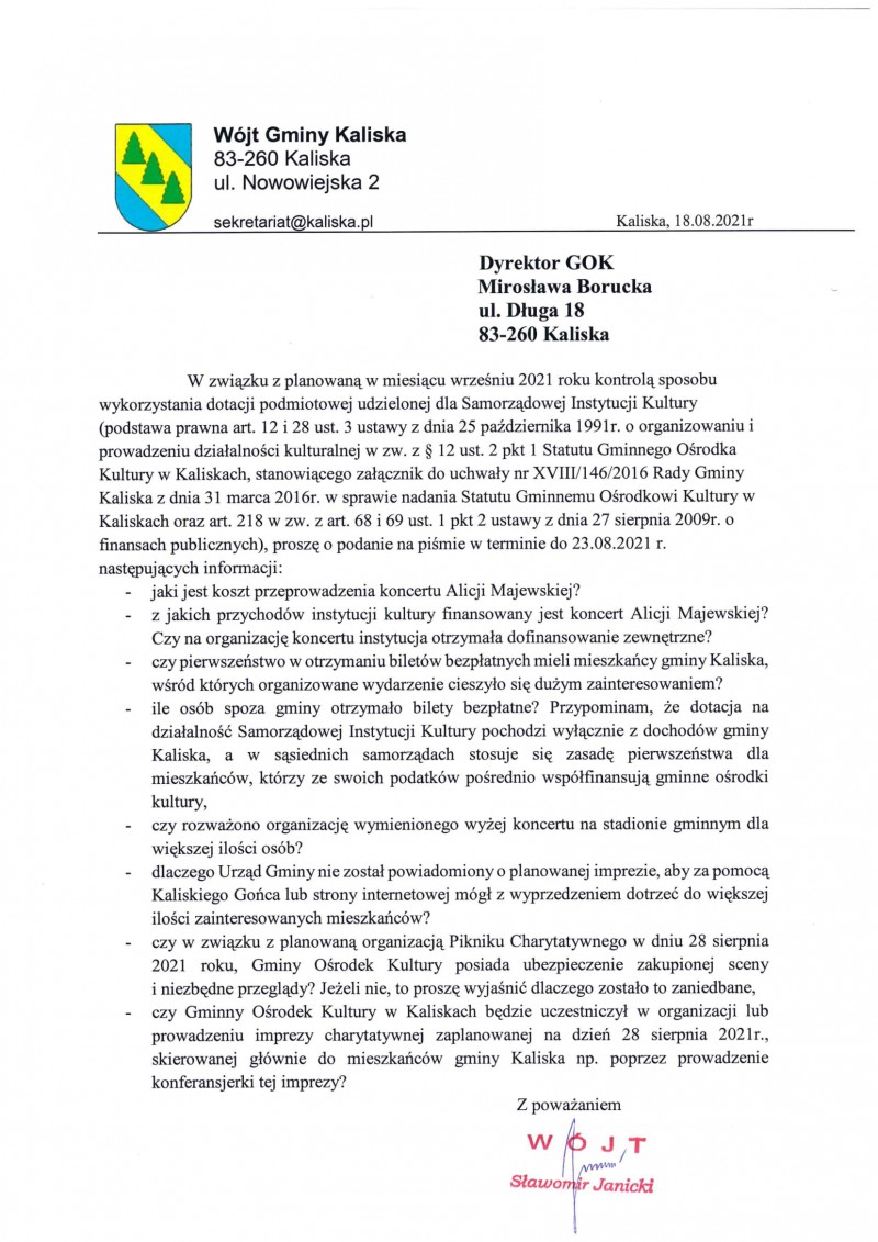 W związku z nieprecyzyjnie udzielonymi odpowiedziami na zapytania radnych i mieszkańców gminy zostało skierowane pismo do Pani dyrektor GOK Kaliska o przygotowanie odpowiedzi na nurtujące mieszkańców pytania.