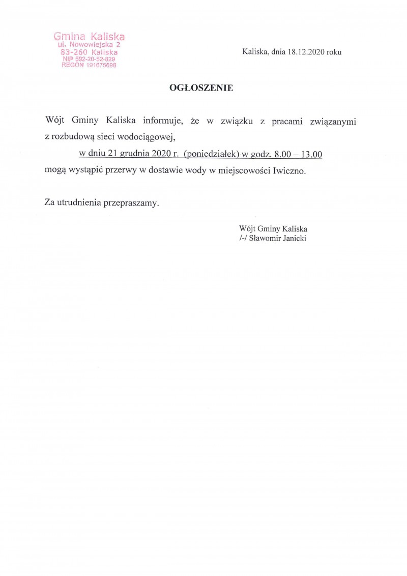 Informacja o przerwie w dostawie wody w miejscowości Iwiczno