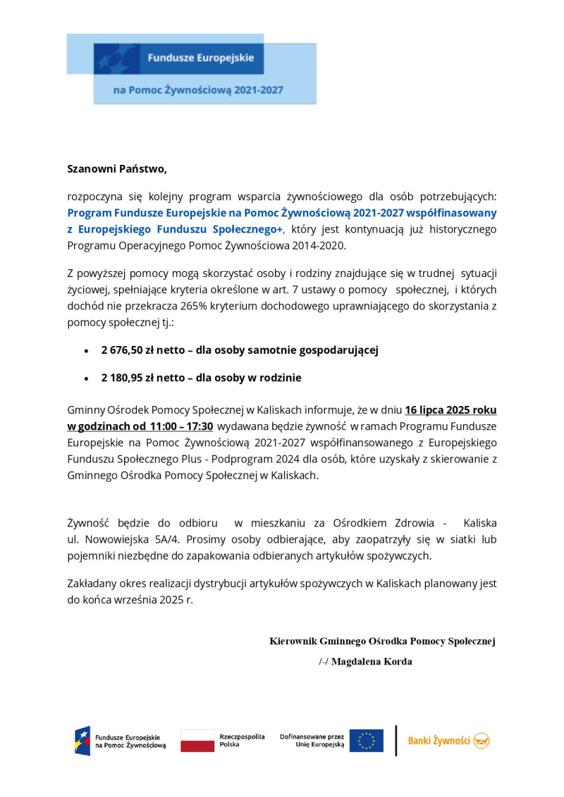 Informacja o wydawaniu żywności w dniu 16.07.2025 r.