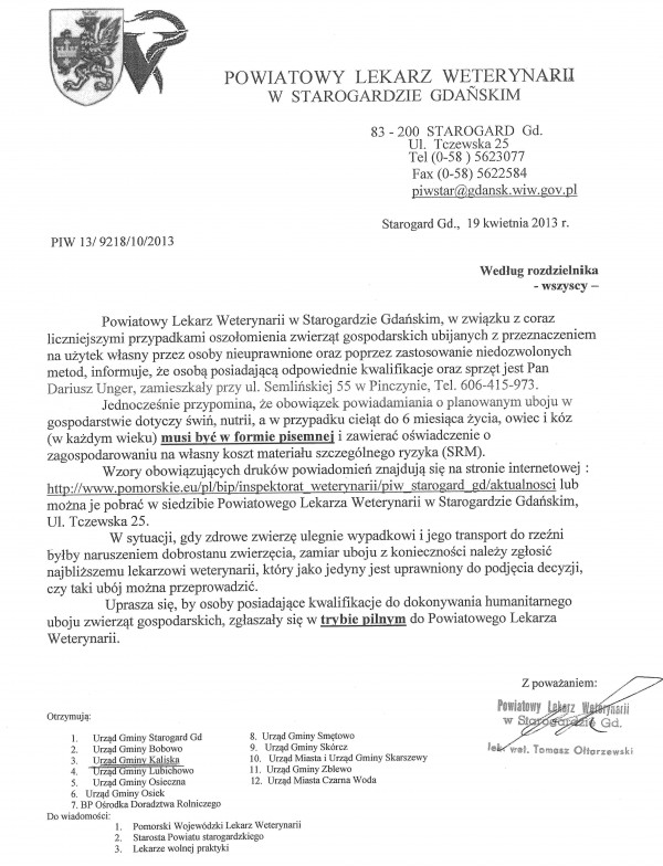 Informacja Powiatowego Lekarza Weterynarii odnośnie przypadków oszałamiania zwierząt gospodarskich.