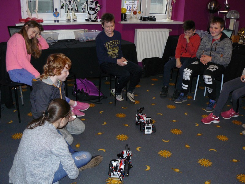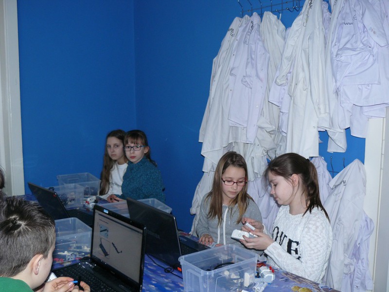 Dla klas IV i V wycieczki odbyły się do pracowni Pana Ciekawskiego na warsztaty z robotyki, gdzie poznawali matematykę jako królową nauk i podstawę wszystkich innych dziedzin, bo to właśnie matematyka jest dostępna w chemii, fizyce, biologii czy nawet medycynie. Praca odbywała się metodą projektową, w kolejności zasad: wyłonienie lidera grupy, zdefiniowanie problemu, funkcji poszczególnych członków, przeszukanie dostępnych zasobów wiedzy, postulaty rozwiązań, wybór rozwiązania, prezentacja. Na zajęciach uczniowie poznawali najnowsze trendy ICT oraz współczesnej robotyki. Pracując na najnowszym technologicznie sprzęcie z dostępem do pełnej bazy programowej i szerokopasmowego internetu, zadaniem uczestników było zbudowanie i zaprogramowanie robota. Końcowym punktem programu było zaprogramowanie robota człekokształtnego do gry w piłkę nożną.