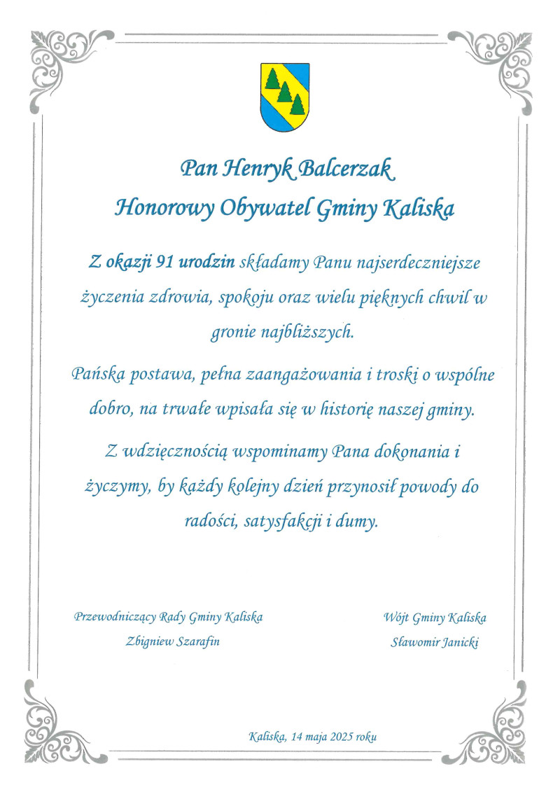 JUBILEUSZ 91. URODZIN HONOROWEGO OBYWATELA GMINY KALISKA PANA HENRYKA BALCERZAKA