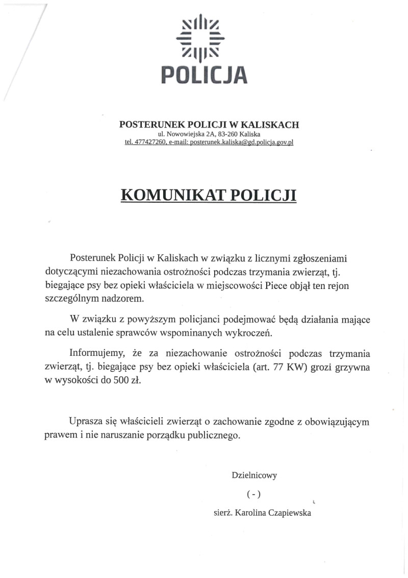 Komunikat Policji w sprawie biegających psów bez opieki właściciela