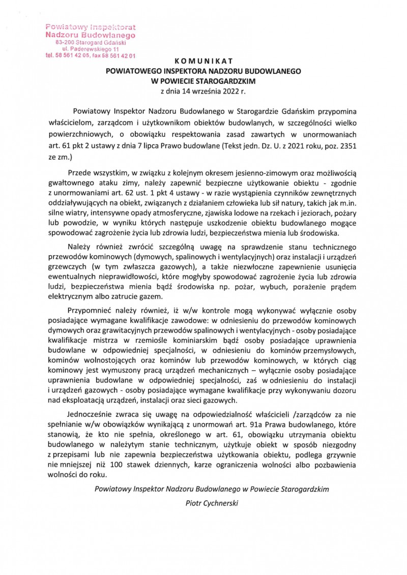 Komunikat Powiatowego Inspektora Nadzoru Budowlanego w Starogardzie Gdańskim o respektowaniu zasad