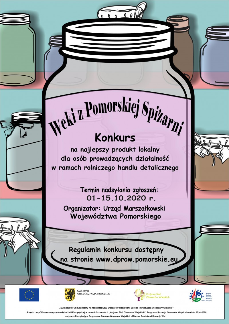 Urząd Marszałkowski Województwa Pomorskiego zaprasza do udziału w konkursie pn. "Weki z Pomorskiej Spiżarni". Konkurs skierowany jest do mieszkańców województwa pomorskiego prowadzących działalność w formie rolniczego handlu detalicznego. Celem konkursu jest zainteresowanie przetwórstwem żywności i sprzedażą produktów wytworzonych z własnej uprawy, hodowli lub chowu, zwiększenie zainteresowania produktami lokalnymi wśród konsumentów oraz promocja i szerzenie dobrych praktyk w zakresie wytwarzania i sprzedaży produktów rolno-spożywczych charakterystycznych dla województwa pomorskiego. Więcej informacji na stronie www.dprow.pomorskie.eu