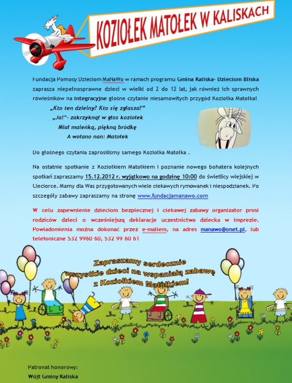 Fundacja Pomocy Dzieciom MaNaWo w ramach programu Gmina Kaliska- Dzieciom Bliska zaprasza niepełnosprawne dzieci w wielki od 2 do 12 lat, jak również ich sprawnych rówieśników na integracyjne głośne czytanie niesamowitych przygód Koziołka Matołka! Na ostatnie spotkanie z Koziołkiem Matołkiem i poznanie nowego bohatera kolejnych spotkań zapraszamy 15.12.2012 r. wyjątkowo na godzinę 10:00 do świetlicy wiejskiej w Cieciorce.