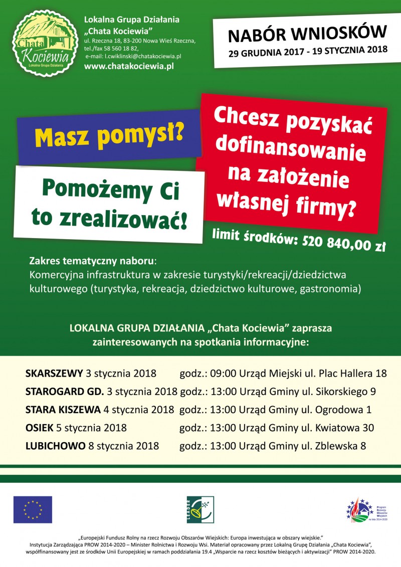 Lokalna Grupa Działania „Chata Kociewia” zaprasza zainteresowanych na spotkania informacyjne