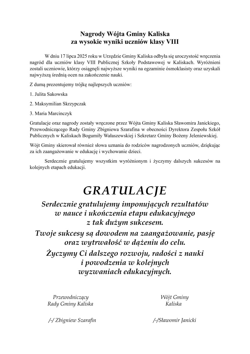 Nagrody Wójta Gminy Kaliska za wysokie wyniki uczniów klasy VIII