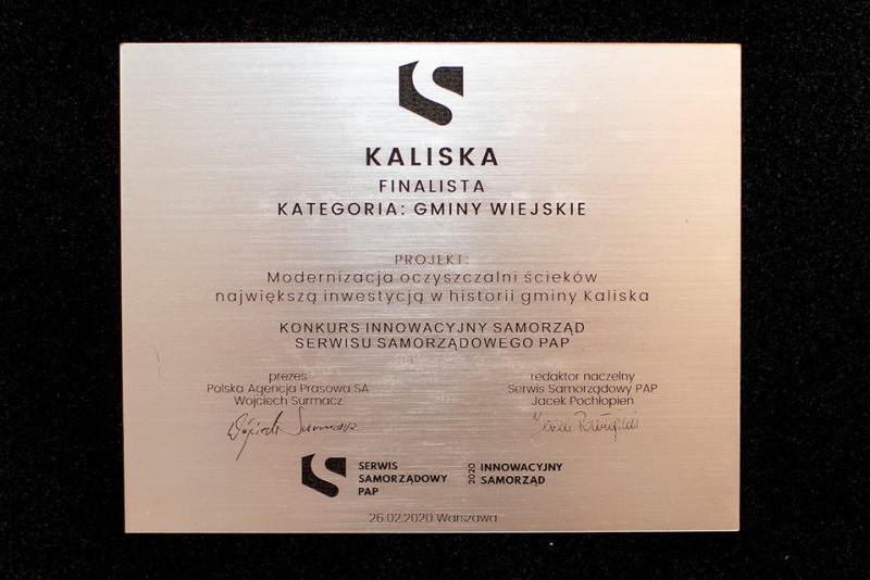 Gmina Kaliska została doceniona za innowacyjne podejście do gospodarki wodno - ściekowej. Wprowadzenie w tym projekcie rozwiązań ekologicznych; własnej farmy fotowoltaicznej, innowacyjnego nadzorowania, monitorowania pracy wszystkich elementów i urządzeń oczyszczalni oraz przepompowni lokalnych. Ponadto rozbudowa oczyszczalni znacząco wpłynie na ochronę środowiska na terenie całej gminy.