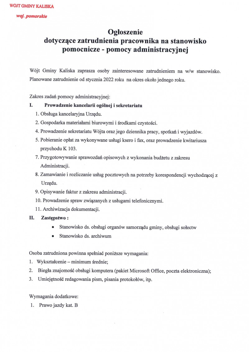 Oferta pracy na stanowisko pomocnicze - Pomoc administracyjna