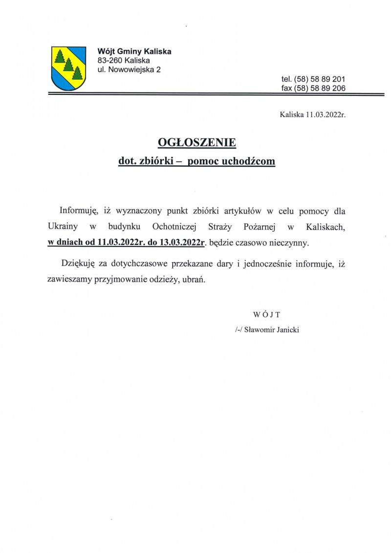 Ogłoszenie dot. zbiórki - pomoc uchodźcom