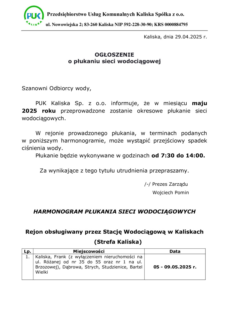 Informacja w sprawie ustalenia czasowego zamknięcia Punktu Selektywnego Zbierania Odpadów Komunalnych w Kaliskach.
