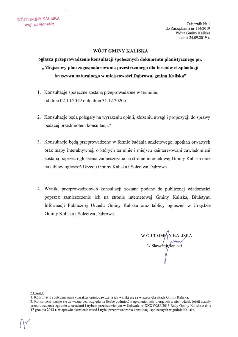 Ogłoszenie o przeprowadzeniu konsultacji społecznych dokumentu planistycznego pn. „Miejscowy plan zagospodarowania przestrzennego dla terenów eksploatacji kruszywa naturalnego w miejscowości Dąbrowa, gmina Kaliska”.