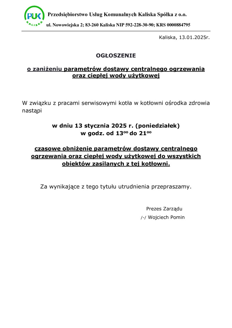 Ogłoszenie o przerwie w dostawie centralnego ogrzewania i ciepłej wody użytkowej