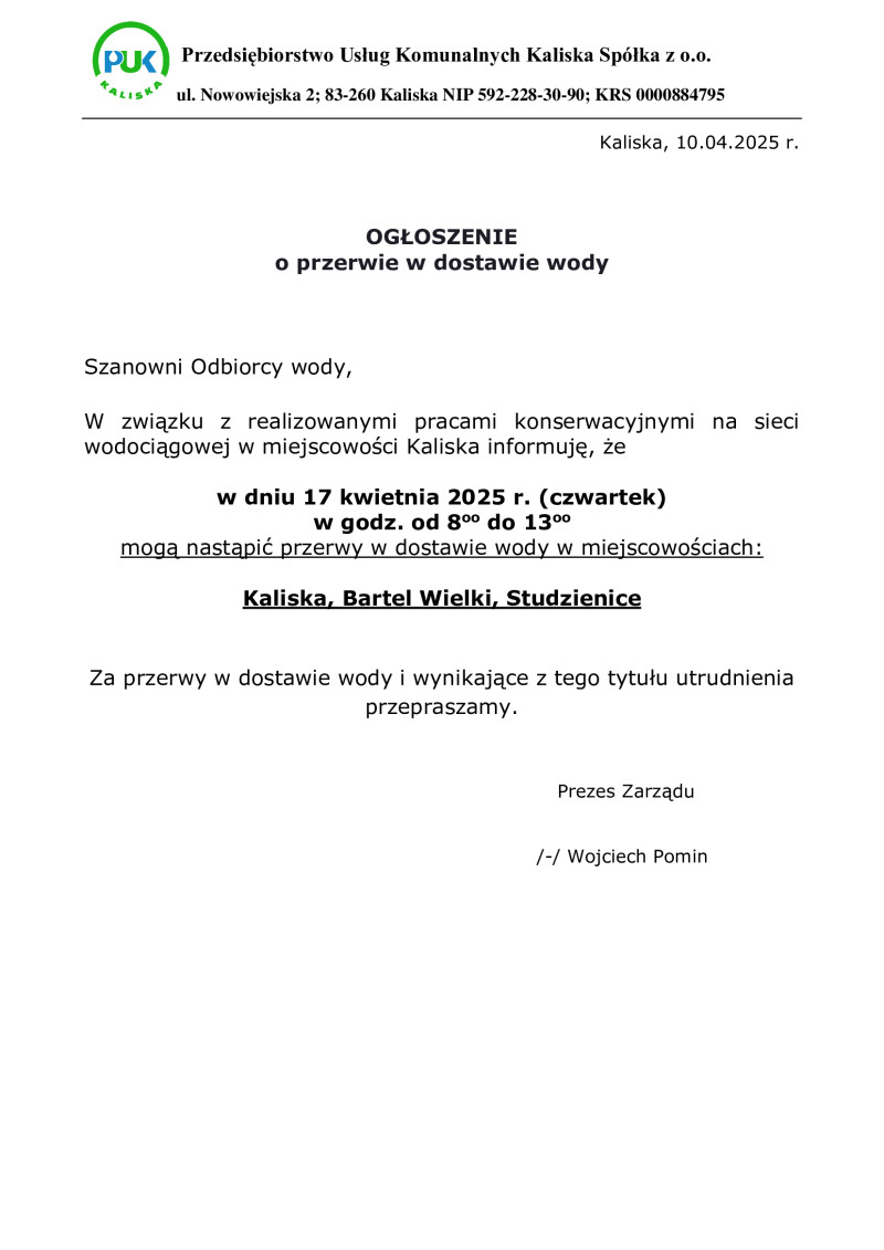 Przewodniczący Rady Gminy Kaliska Zbigniew Szarafin zaprasza na X Sesję Rady Gminy Kaliska