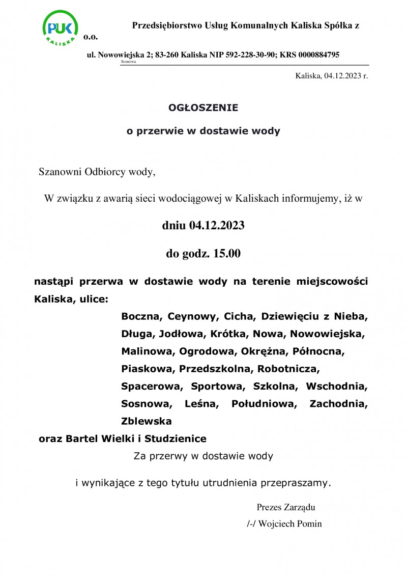 Ogłoszenie o przerwie w dostawie wody