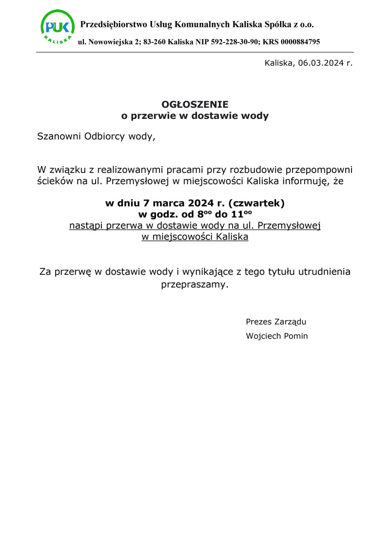 Ogłoszenie o przerwie w dostawie wody