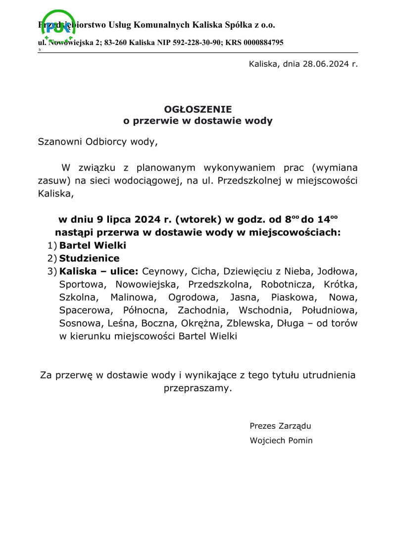Przewodniczący Rady Gminy Kaliska Zbigniew Szarafin zaprasza na X Sesję Rady Gminy Kaliska