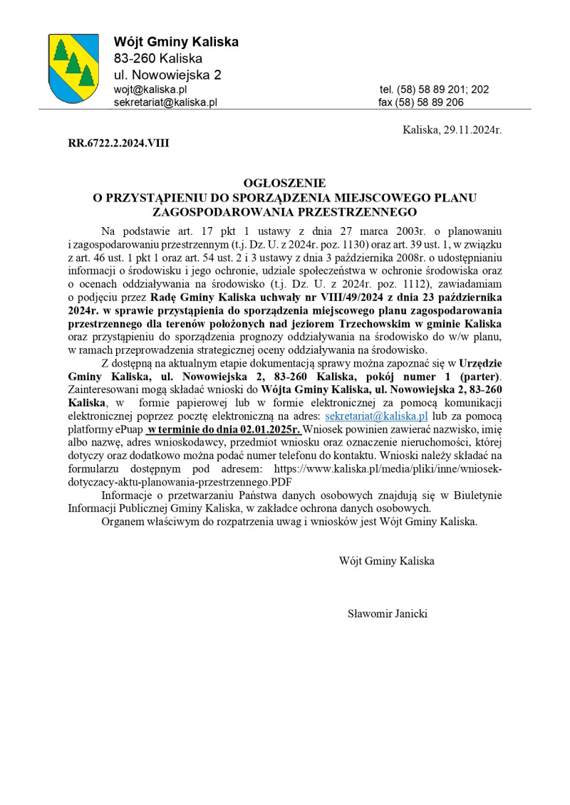 Ogłoszenie o przystąpieniu do sporządzenia miejscowego planu zagospodarowania przestrzennego