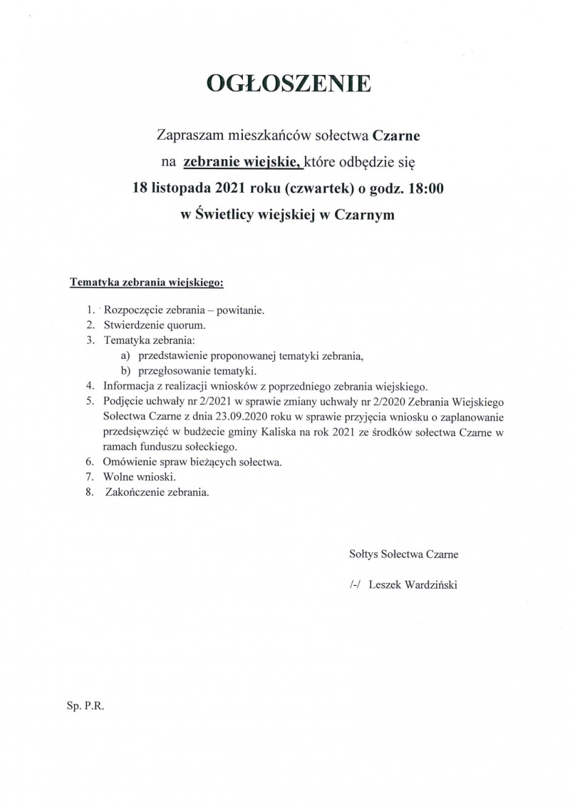 Ogłoszenie o zebraniu wiejskim w miejscowości Czarne