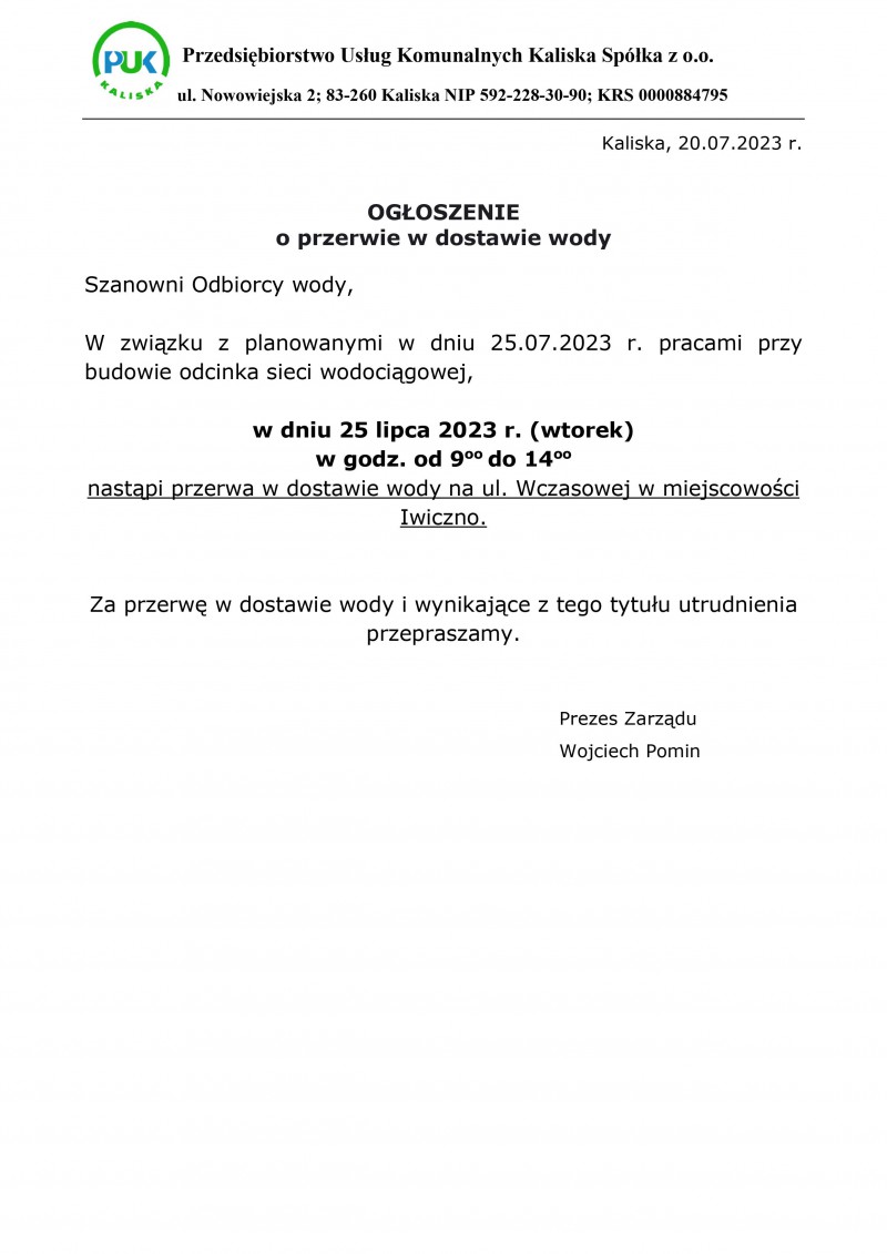 OGŁOSZENIE - Przerwa w dostawie wody