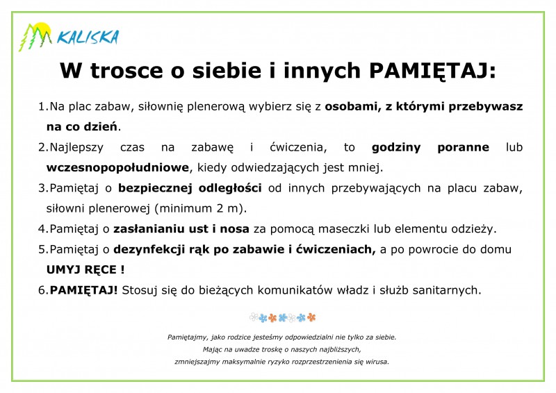 Wytyczne GIS przeciwepidemiczne dla funkcjonowania placów zabaw (zlokalizowanych na otwartym powietrzu) w trakcie epidemii SARS-CoV-2 w Polsce: https://gis.gov.pl/bez-kategorii/wytyczne-przeciwepidemiczne-dla-funkcjonowania-placow-zabaw-zlokalizowanych-na-otwartym-powietrzu-w-trakcie-epidemii-sars-cov-2-w-polsce/