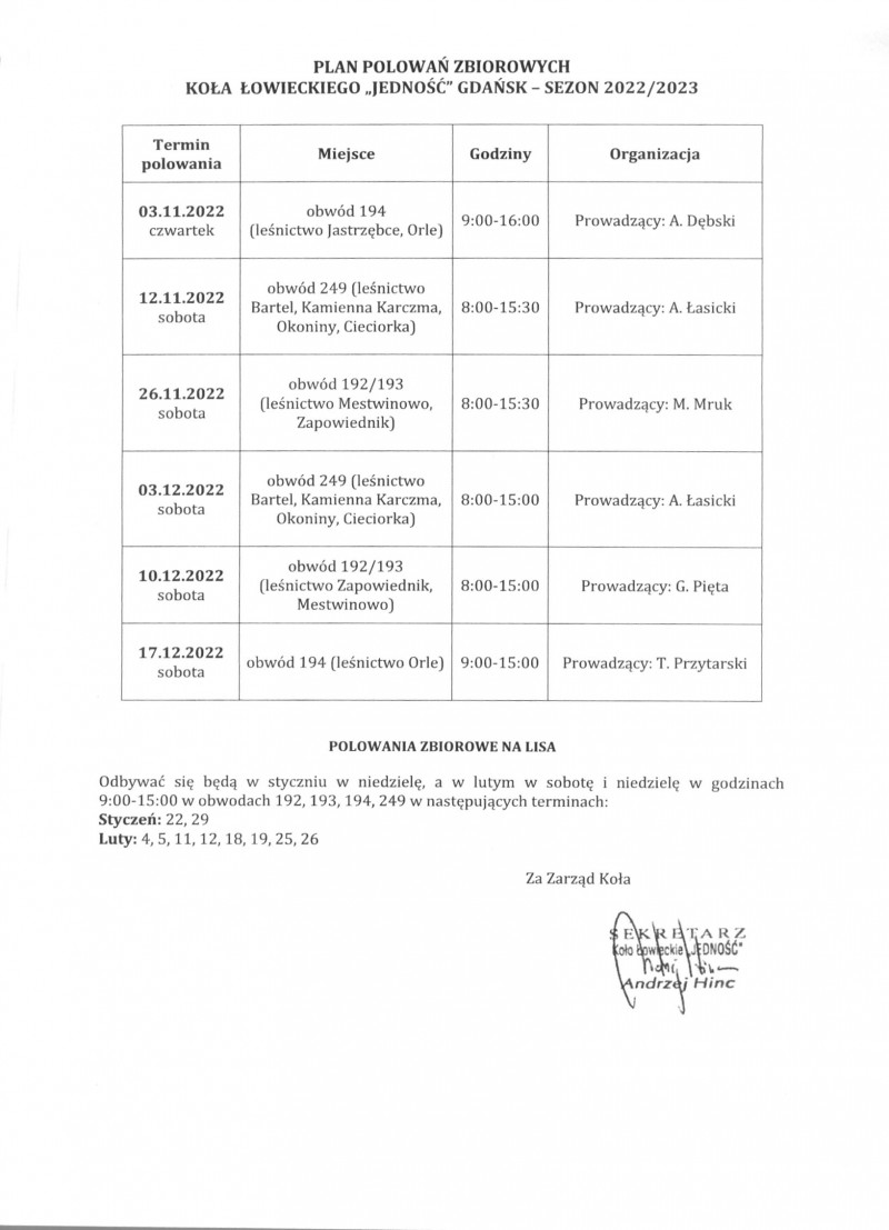 Plan polowań zbiorowych Koła Łowieckiego „Jedność”