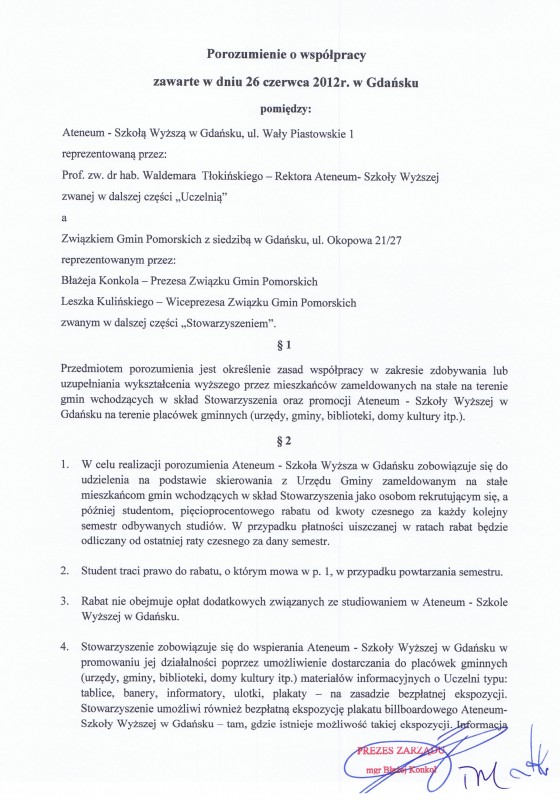 Wójt Gminy Kaliska informuje o zawartym porozumieniu przez Związek Gmin Pomorskich, którego członkiem jest Gmina Kaliska, z Ateneum – Szkołą Wyższą w Gdańsku. Porozumienie dotyczy możliwości ubiegania się przez rozpoczynających studia mieszkańców Gminy Kaliska o 5% bonifikatę w opłacie za czesne przez cały okres studiów na tej uczelni.