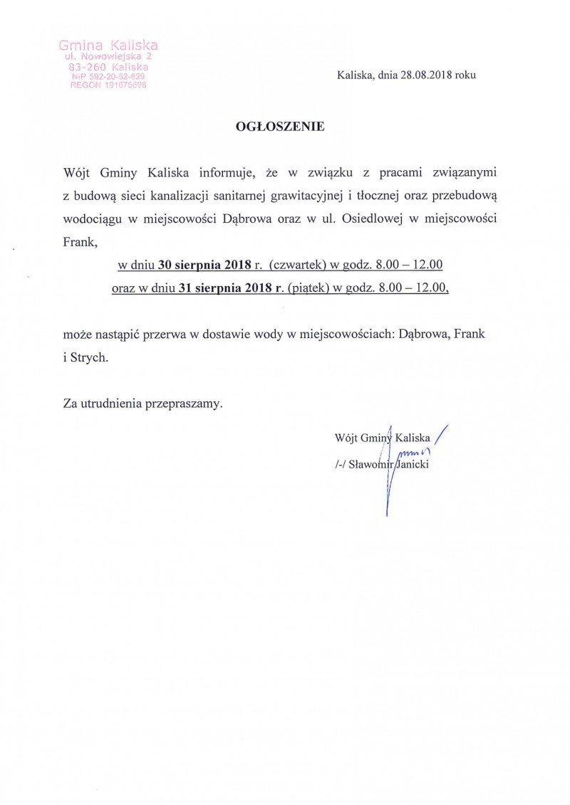 Przerwa w dostawie wody w miejscowościach: Dąbrowa, Frank i Strych
