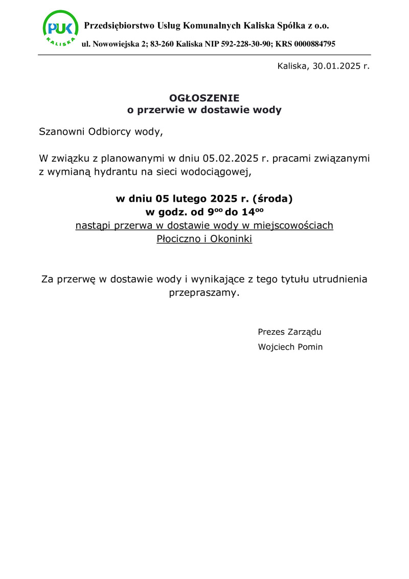 Przerwa w dostawie wody w miejscowościach Płociczno i Okoninki