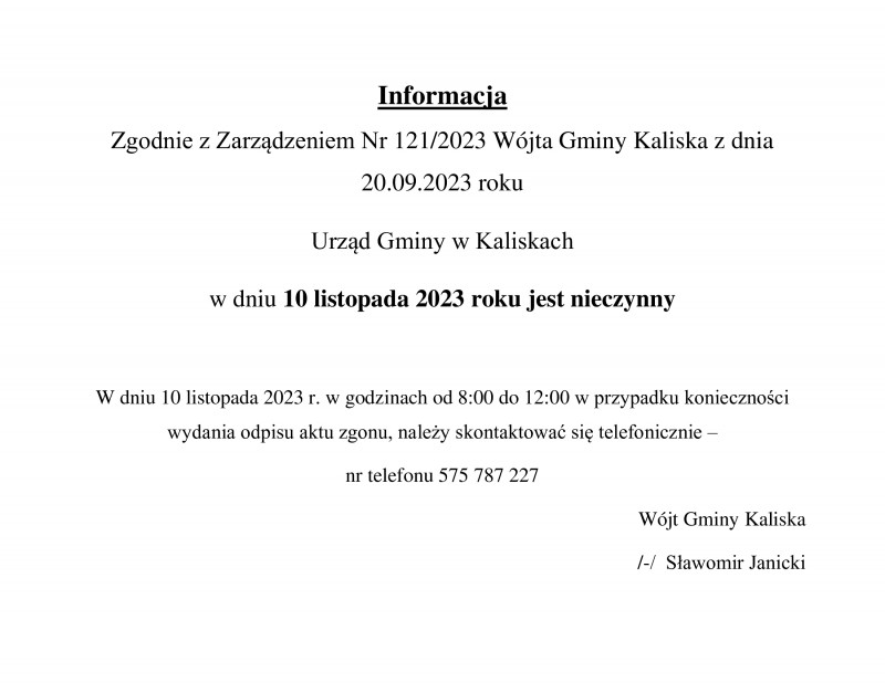 Urząd Gminy w Kaliskach w dniu 10 listopada 2023 r. jest nieczynny