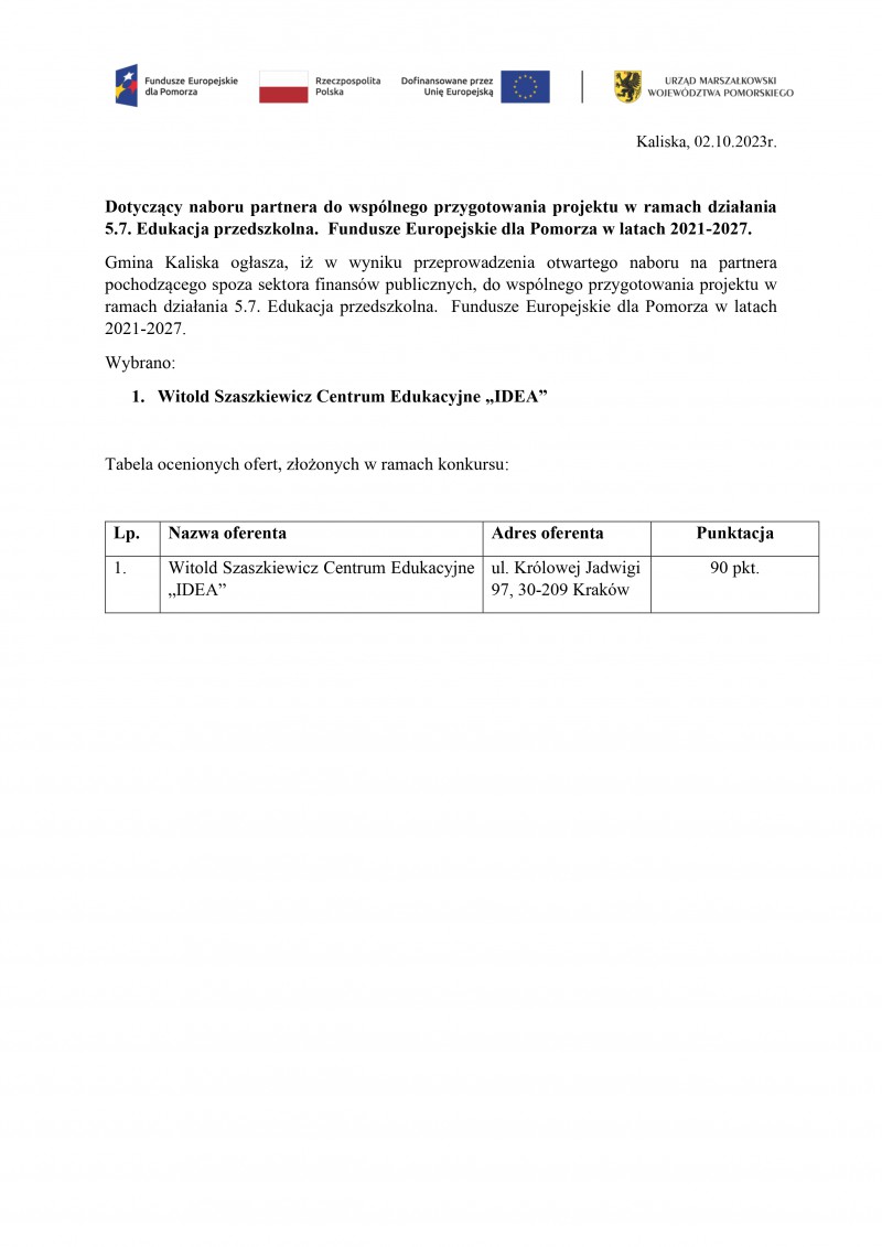 Wyniki z przeprowadzenia otwartego naboru na partnera do wspólnego przygotowania projektu w ramach działania 5.7. Edukacja przedszkolna.