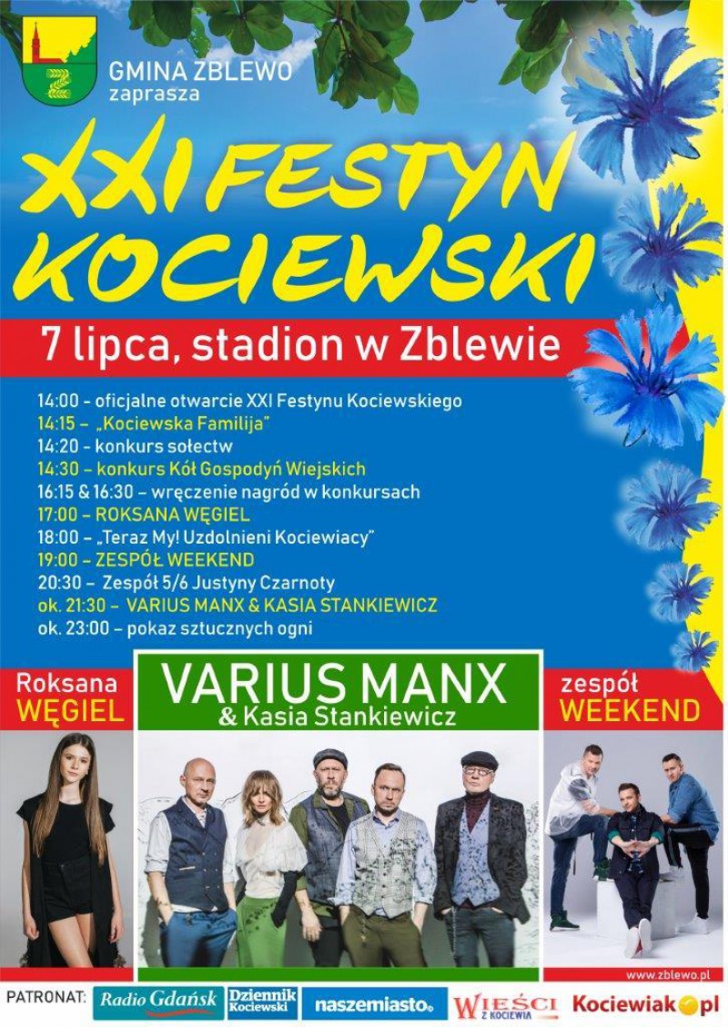 Gmina Zblewo serdecznie zaprasza na XXI Festyn Kociewski – fantastyczną, letnią imprezę pełną gwiazd, dobrej muzyki, słońca i świetnej zabawy! Na nasz festyn od wielu lat ściągają do Zblewa tysiące gości! W tym roku zapraszamy w niedzielę 7 lipca – startujemy o godz.14:00, a spotykamy się jak zawsze na stadionie sportowym w Zblewie.