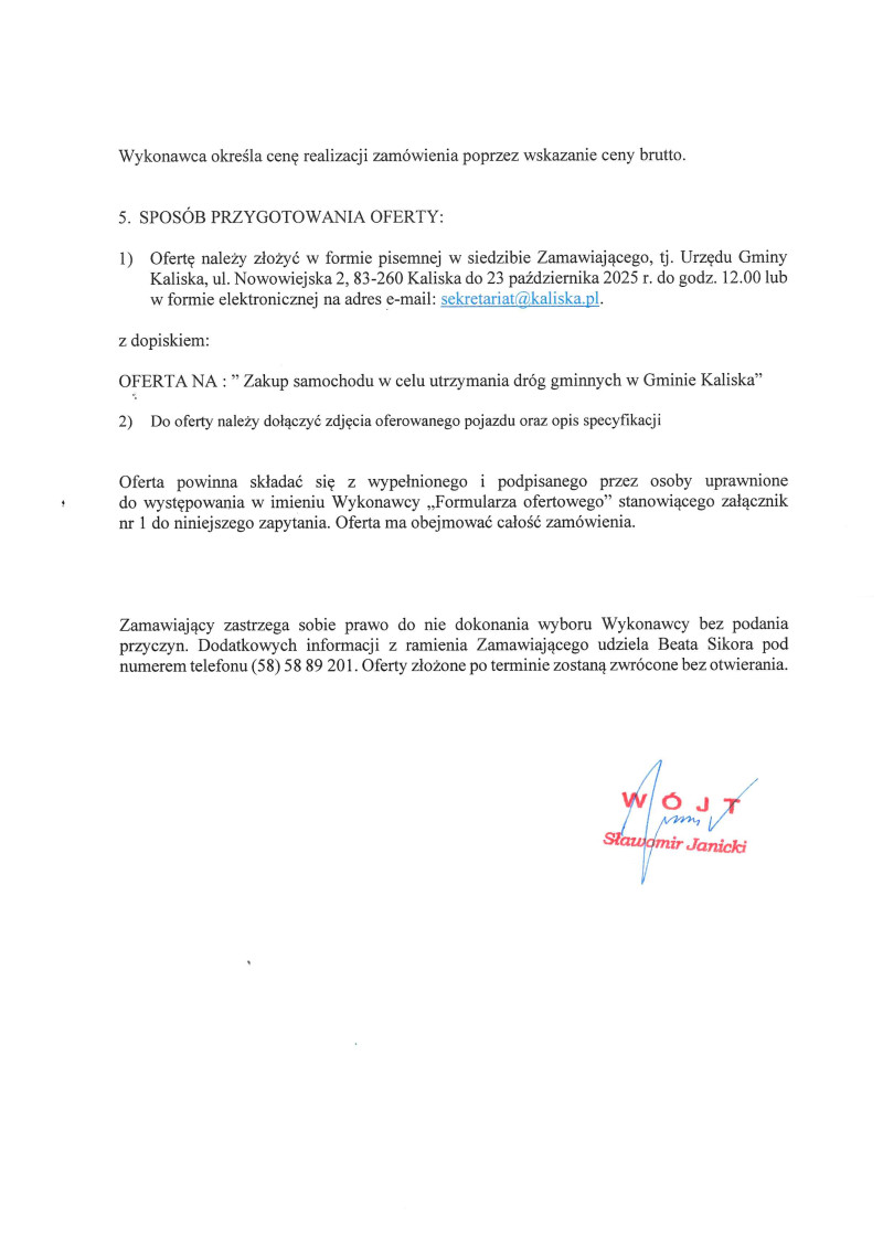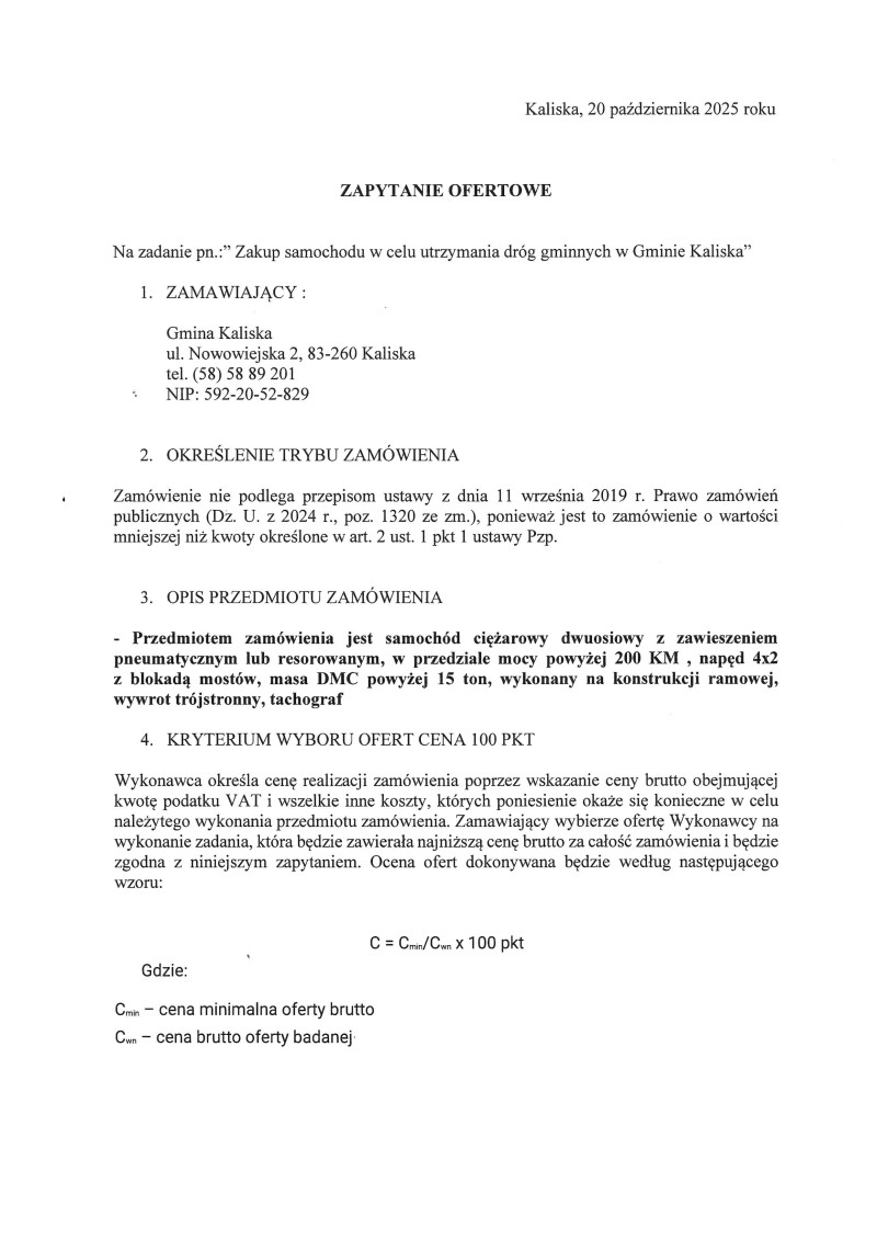 Zapytanie ofertowe - zakup samochodu w celu utrzymania dróg gminnych w Gminie Kaliska